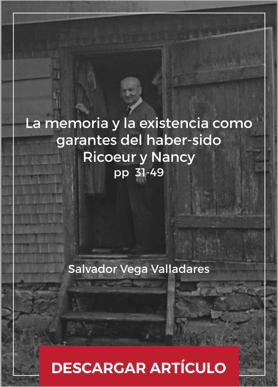 El segundo artículo, elaborado por Salvador Vega Valladares, quien realiza un doctorado en la UMSNH, invita a la consideración de la memoria y la existencia como garantes del habersido. Para ello, vincula los pensamientos de Ricoeur y Nancy, justificando en todo momento que ambos filósofos, a pesar de mostrar diversos métodos y aproximaciones, mantienen su óptica en un mismo problema. El trabajo de Vega invita al lector a considerar las consecuencias de haber existido, distinguiendo que no hay una formar de dar marcha atrás ante lo que hemos sido.