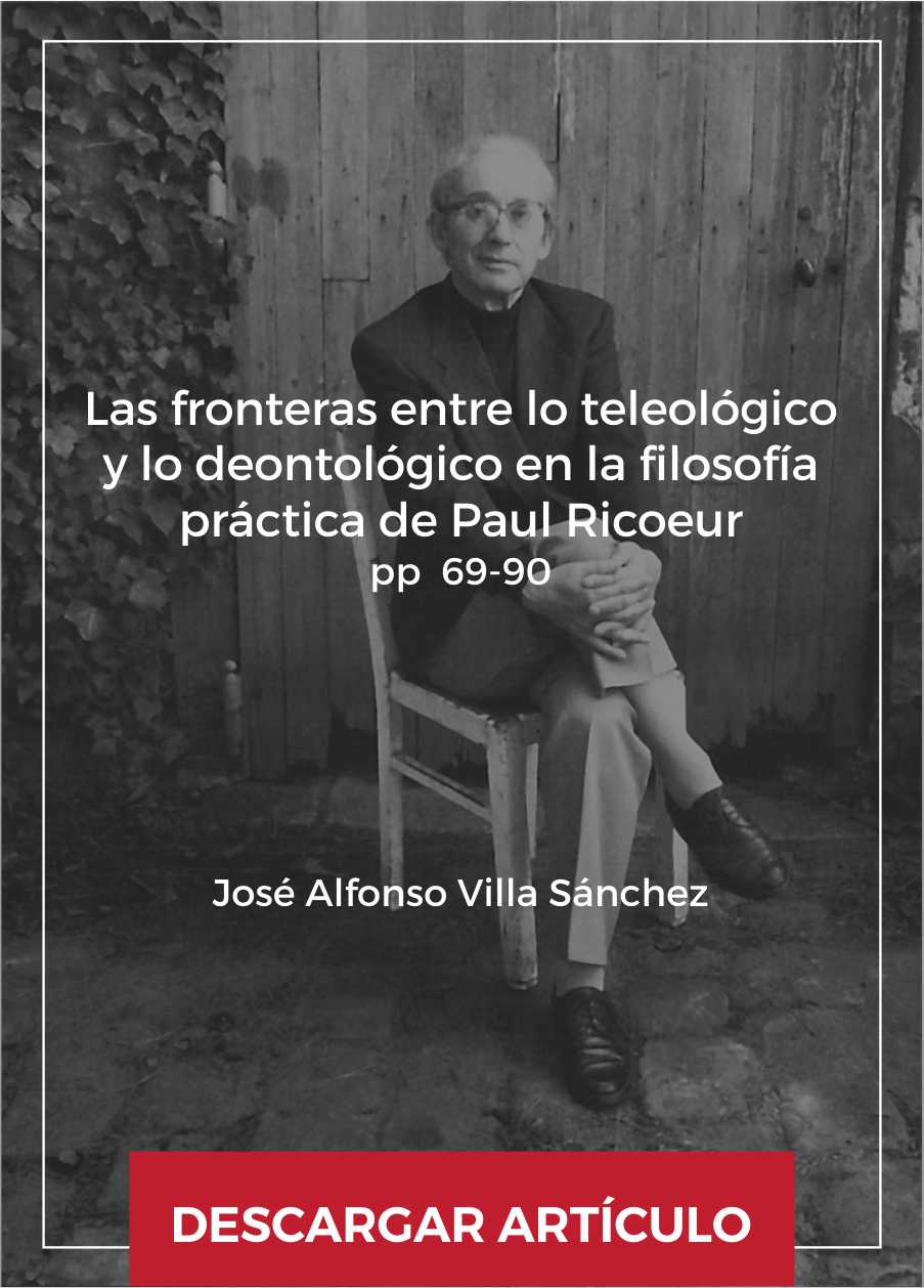 Por último, el cuarto artículo del presente número, fruto de la autoría de José Alfonso Villa Sánchez, investigador en el Instituto de Investigaciones Filosóficas de la Universidad Michoacana de San Nicolás de Hidalgo, aborda un estudio sobre las fronteras entre lo teleológico y lo deontológico en la filosofía práctica de Paul Ricoeur. Para ello, vincula el pensamiento del francés con las propuestas de Aristóteles y Kant, representantes de la tradición teleológica y deontológica. Según Villa, ambas posturas no se excluyen, sino que tienen en común el interés por una ética de bienes.