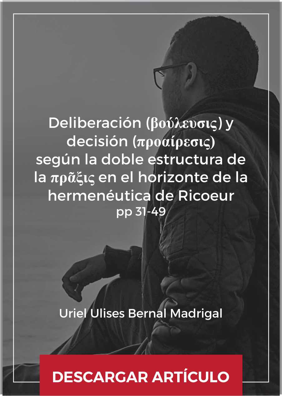 El segundo artículo, elaborado por Uriel Ulises Bernal Madrigal, invita al lector a un análisis entre las situaciones concretas que exigen una decisión y la dimensión global que trasciende la situación dada. Con oportunas referencias al pensamiento de Alejandro Vigo, el autor profundiza en el séptimo estudio incluido en la obra Sí mismo como otro de Ricouer. De tal manera, el concepto de deliberación no podrá ser comprendido de manera unívoca, sino en razón de su relación contextual a una situación concreta. Además, Bernal tiene el acierto de acudir a la Ética a Nicómaco, obra aristotélica que es referente ineludible en lo tocante a la deliberación.